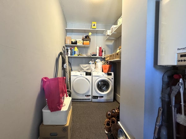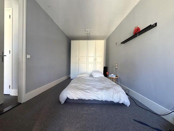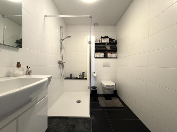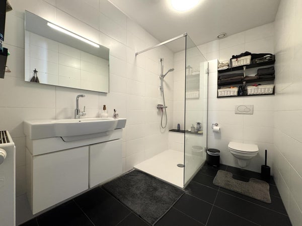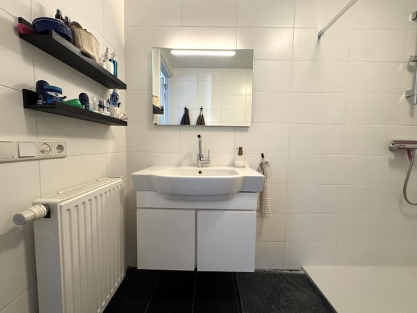 The apartment has two bedrooms, including a spacious master bedroom of approximately 20 m² and a second bedroom of approximately 9 m². The bathroom is equipped with a shower, wall-mounted toilet, and a sink unit. Additionally, there is a practical laundry room with connections for a washing machine and dryer, as well as the setup for the HR combi boiler. The washing machine and dryer are included in the rental of this apartment.