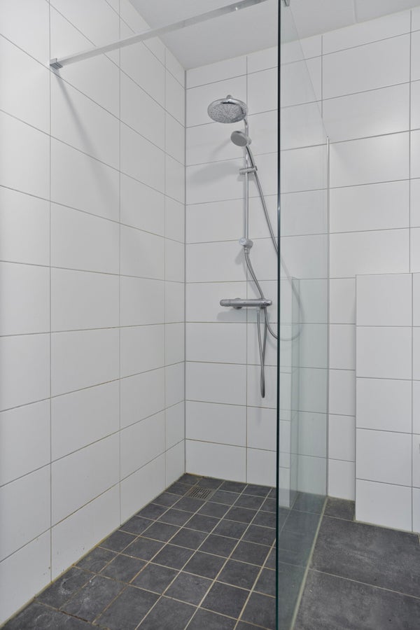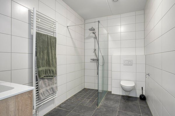 The apartment has a living area of 90 m² and includes three rooms, including two spacious bedrooms. The bathroom is equipped with a modern shower and there is a separate toilet for extra convenience.