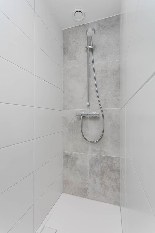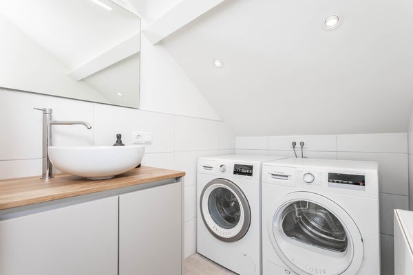 - Modern bathroom with spacious shower, bathroom cabinet, mirror, washing machine, and dryer