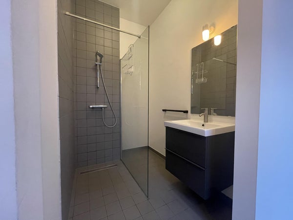 Entrance apartment. At the rear of the apartment is the living room and a half open kitchen. The kitchen is equipped with dishwasher, fridge freezer, 4 burner electric hob and extractor. The living room has large windows. From the living room you come out to the bedroom, the bedroom is located at the front of the apartment The bedroom has an ensuite bathroom this is equipped with a walk-in shower, toilet and a large sink.