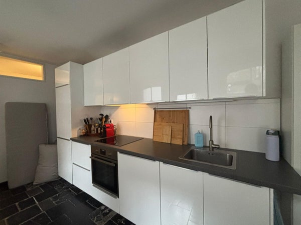 The recently renovated modern kitchen is both practical and stylish and is equipped with various built-in appliances, including a dishwasher, a four-burner induction cooktop, and a refrigerator with a separate freezer compartment. From the kitchen, there is access to the charming private city garden, which features an external storage unit and a passage to the hallway with a modern toilet and washbasin.