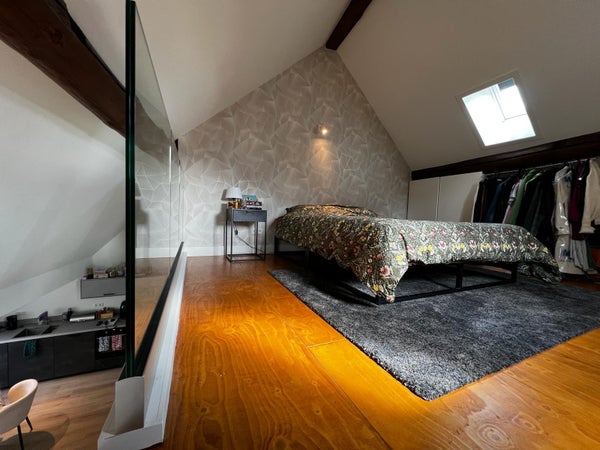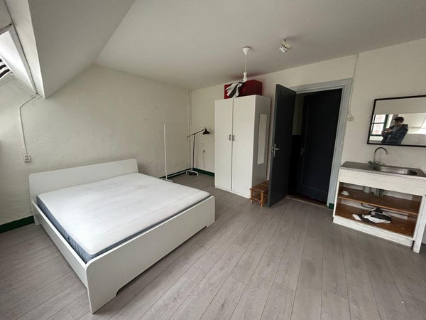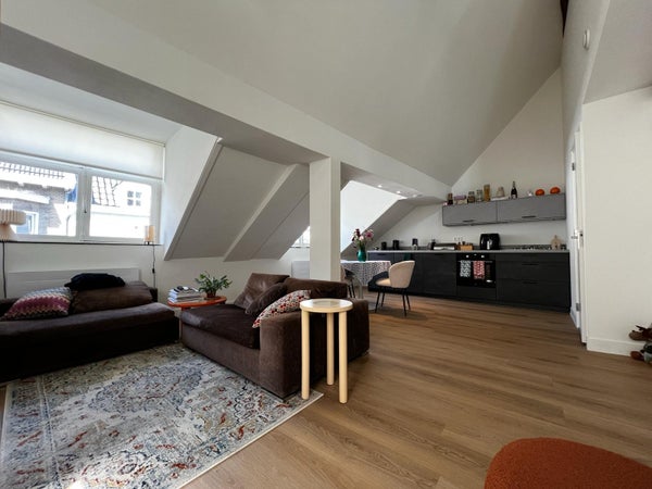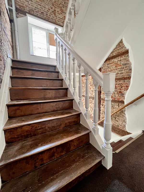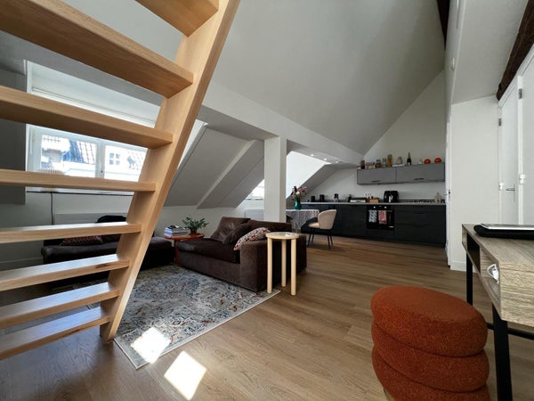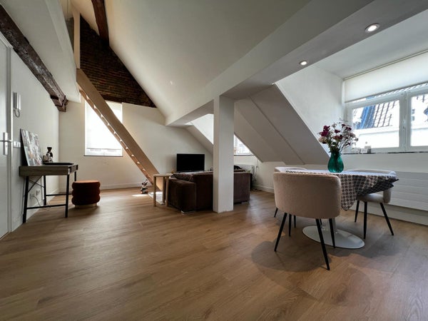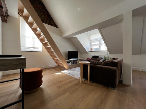 2nd Floor: landing with entrance door to the apartment. The apartment is located at the rear of the building. Direct access to the living room with open kitchen 26 m² with built-in appliances: sink, dishwasher, 4-burner induction hob with extractor, oven and high model fridge / freezer combination. Via the living room access to the bathroom of 3,75 m² with shower, toilet and storage room with washing machine. Via a staircase access to the bedroom of 13 m² with beautiful wooden beams and beautiful authentic wooden floor.