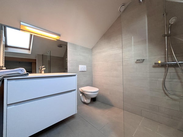The spacious living room is practically laid out and offers a pleasant living area with ample space for both a seating and dining area. Thanks to the open design and the abundant natural light, the room has a bright and welcoming atmosphere. The living room is directly connected to the kitchen, creating an open and functional living environment. The kitchen is fully equipped and features modern built-in appliances, including a four-burner induction cooktop, extractor hood, refrigerator, combi oven, and dishwasher. There is sufficient worktop and storage space, making the kitchen both practical and comfortable to use, and allowing it to blend seamlessly into the living area. The sleeping area is located on the mezzanine and offers a calm and open layout with views over the kitchen, contributing to the apartment's spacious feel. Additionally, the apartment includes a separate toilet and a practical laundry room with a washing machine connection, providing extra convenience for daily living. The bathroom is modern and neatly finished and features a spacious walk-in shower. Finally, the apartment also has a balcony, a pleasant outdoor space where you can enjoy some peace and fresh air.