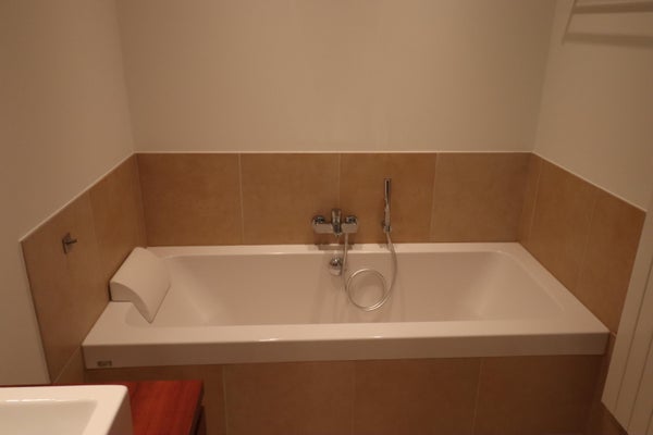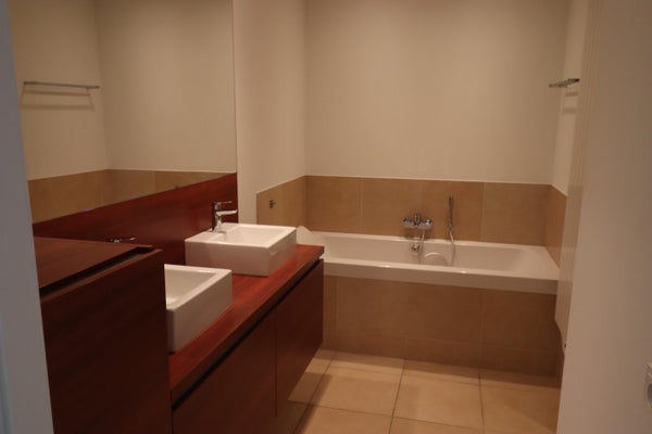 The modern, luxurious bathroom is tiled and equipped with recessed lighting (can be dimmed), bath, walk-in shower, wall radiator and a modern double washbasin with furniture. The separate toilet room is equipped with a wall closet and a sink.