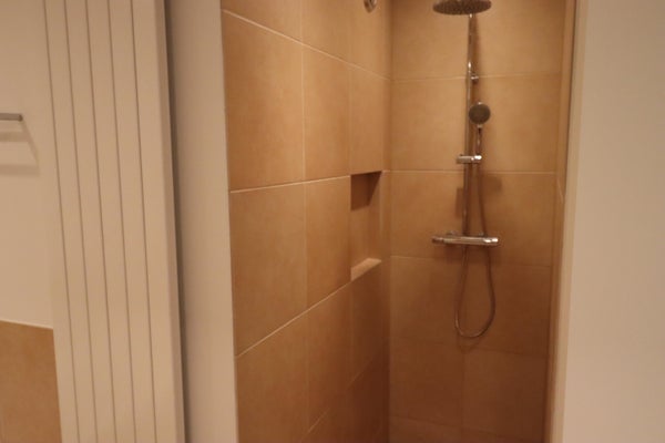 In the closet wall is the door to the third bedroom with Velux skylight ( wireless controllable) followed by the second bathroom. This is a luxuriously and modern furnished and equipped with a large walk-in shower, toilet, fixed cupboard, washbasin furniture with large mirror and a design wall tap.
