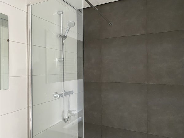 In the bathroom, you will find a washbasin with washbasin furniture, shower with shower fixture, and shower screen.