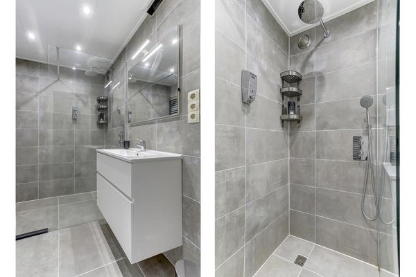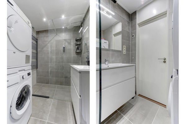 The storage room is located inside the building and is accessible to residents only. It contains shelving and a cupboard, making it easy to store many items. There is also sufficient space for a scooter or bicycles.