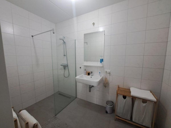- (Partly) tiled bathroom with walk-in shower, washbasin with cabinet and mirror and towel radiator;