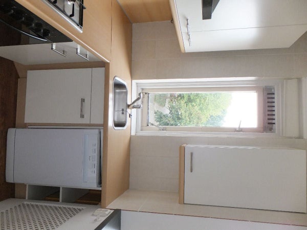 Modern half open kitchen with sink, extractor hood, oven, refrigerator with a little freezer in it, gas hob and dishwasher. Storage space with central heating system.