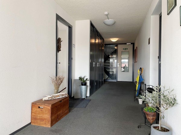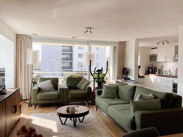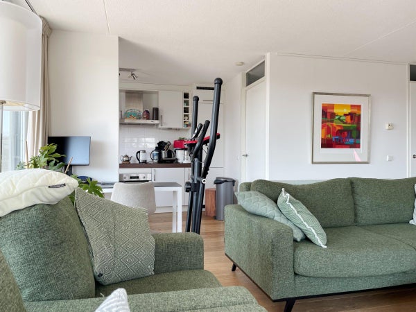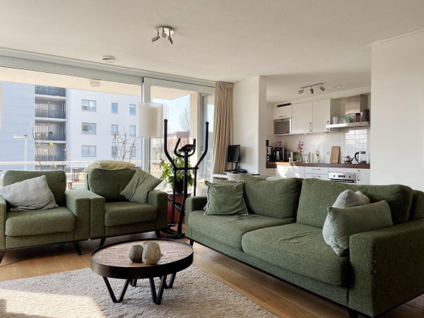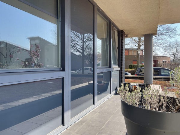 Second floor: Access to the apartment by means of the gallery. From the hall of the apartment are several rooms to enter. The separate toilet is located here. Through the hallway, both the living room and the semi-open kitchen are directly accessible. The living room has a beautiful wooden floor and because of the many windows plenty of light. The sliding door gives access to the sunny balcony which is located on the south. The kitchen is modern and has all kinds of appliances, namely, fridge freezer, microwave, induction hob, extractor and dishwasher.