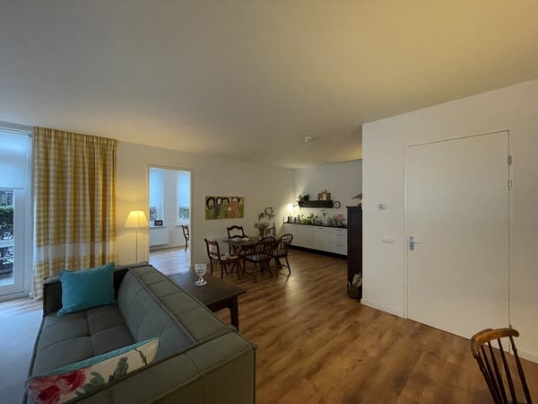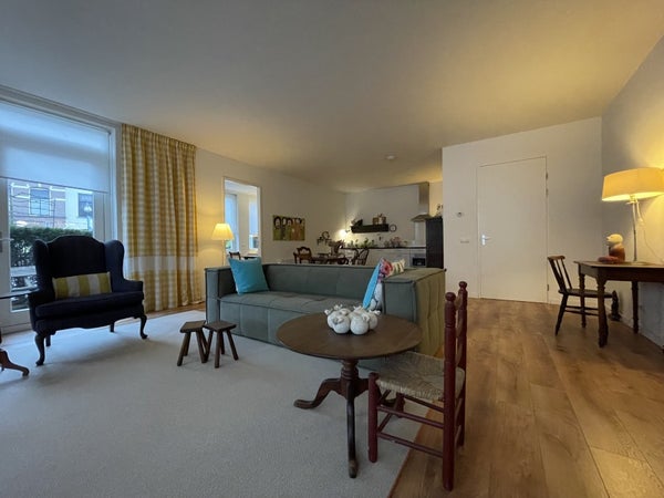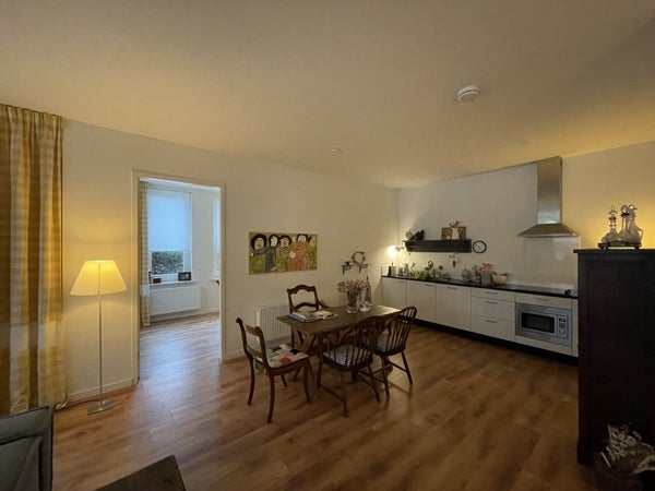 Spacious entrance/hall, separate toilet room with sink. The living room located at the front has an open kitchen equipped with an induction hob, extractor hood, fridge, dishwasher, and combi microwave. Through the living room, you have access to the first bedroom, which can also be used as an extra sitting room. The second bedroom and the laundry room can be reached from the hall. The bathroom has a modern finish and features a shower, sink, designer radiator, and a second toilet. The complex is equipped with an elevator, private parking space, and storage on the ground floor.