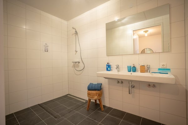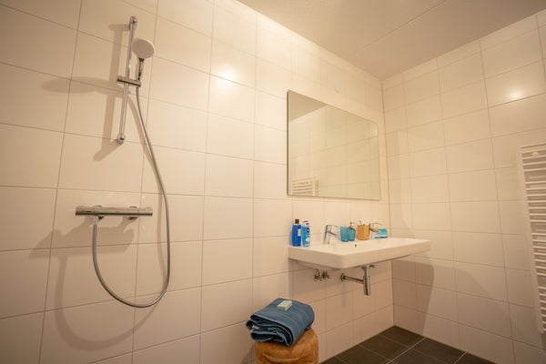 The apartment is located on the first floor and is accessible via the central hall. The indoor entrance provides extra comfort. Upon entering, you arrive in the hall, with the indoor storage room on the left side containing the heat recovery system and connections for the washing machine and dryer. Further down the hall are the separate toilet with sink and the modern bathroom. This is equipped with a walk-in shower, a double sink with mirror, and an electric designer radiator.