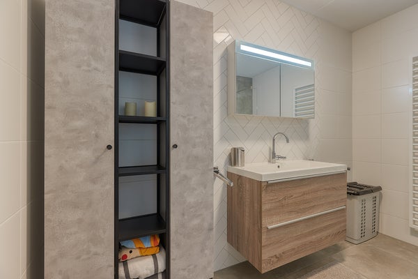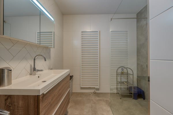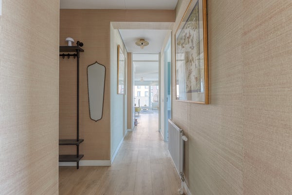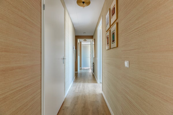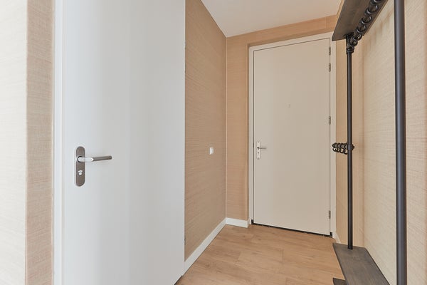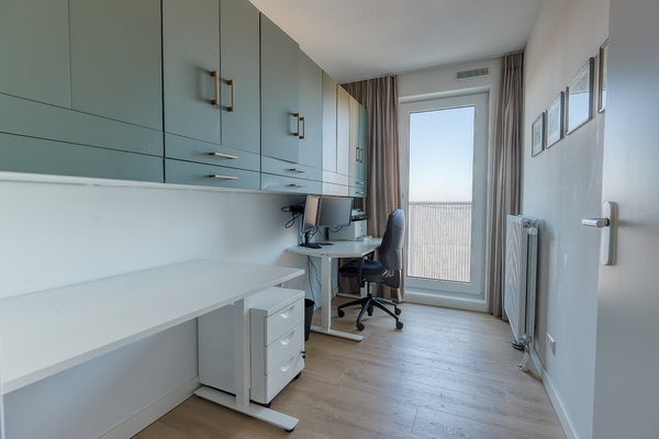 Upon entering the apartment, you step into a spacious and bright hallway that provides access to all rooms. The neat finishing, high ceilings, and sleek walls immediately create a well-maintained and luxurious appearance. The spacious living room is a wonderful living area. Thanks to the large windows, the room enjoys an abundance of natural light, creating a warm and cozy atmosphere. From the living room you have access to the balcony, where you can enjoy the unobstructed view in peace. The modern open kitchen connects seamlessly with the living space and is finished in a stylish and timeless design. The kitchen is equipped with all necessary built-in appliances, including an induction cooktop with extractor hood, a spacious combi-oven, dishwasher, and a refrigerator with freezer. The apartment has two spacious and charming bedrooms, one of which includes a walk-in closet, as well as a separate study room. The luxurious and well-maintained bathroom is modernly finished and equipped with a spacious walk-in shower and a stylish washbasin cabinet. The high-quality materials and careful finishing give the room a fresh and comfortable appearance. The property also features a separate floating toilet with a small sink and a separate storage room where the washing machine and dryer are installed.
