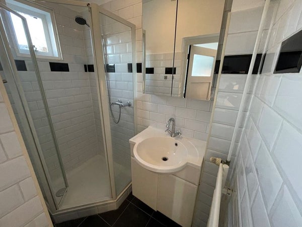 Next to the kitchen is the bathroom with a neat shower cabin and sink with a large mirror cabinet.