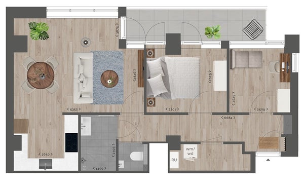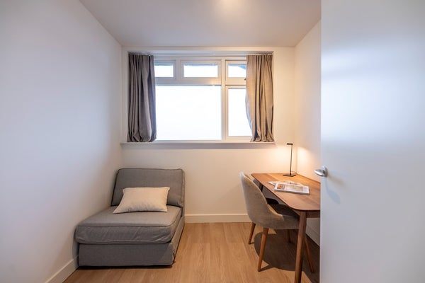 The master bedroom has a contemporary look and is furnished with a double bed, bedside tables, and a wardrobe. The second bedroom is slightly smaller and set up as a flexible space with a desk and a sofa bed, ideal as a home officie, guest room, or hobby room.