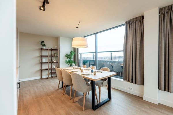 12th floor (top floor): The spacious and bright living room is a beautiful and bright space and has a lovely open kitchen which is equipped with appliances such as a combi-oven, induction hob with extractor, dishwasher, fridge/ freezer and a sink. A lovely sitting- and dining area is created in this L-shaped room and there is also an additional (and second) work space created here. Via the living area you can enter the spacious L-shaped balcony from there your can enjoy a spectaculair view over the city center of Rotterdam!