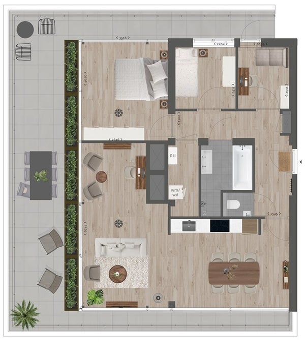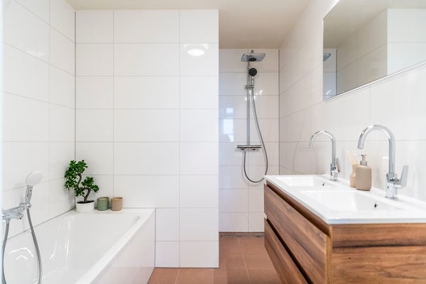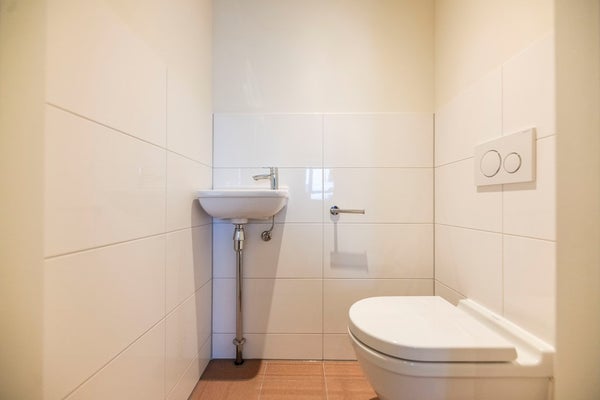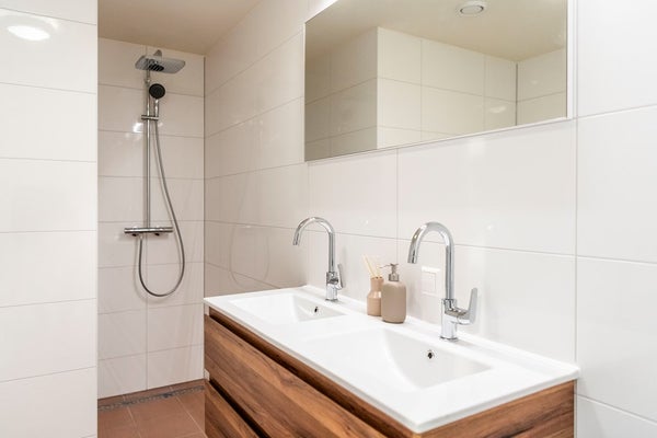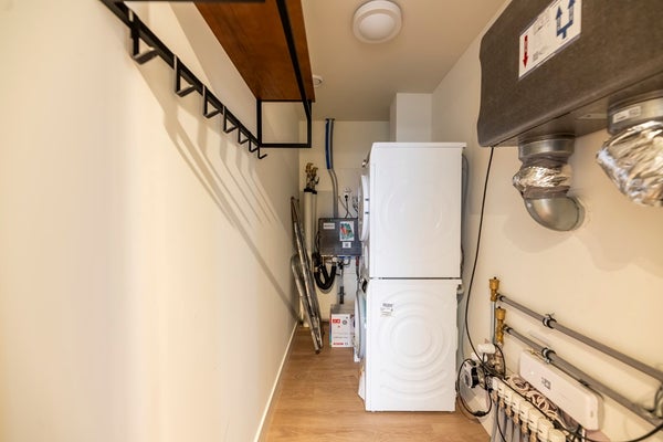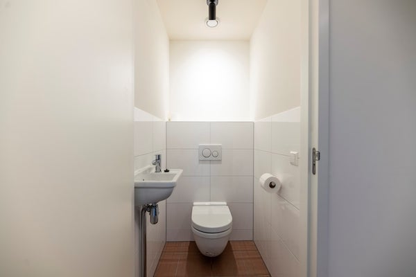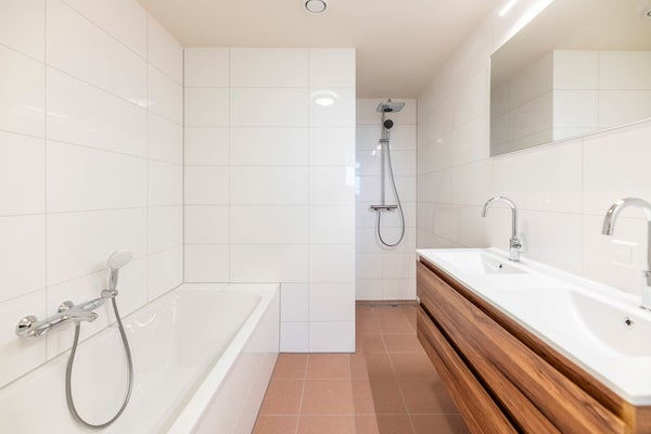 In the modern bathroom you can find a lovely walk-in rain shower, bathtub and double sink with mirror and cabinets. The toilet is separate from the bathroom and has a small sink. Via the hall you can enter the internal storage where the wash/dry combination.