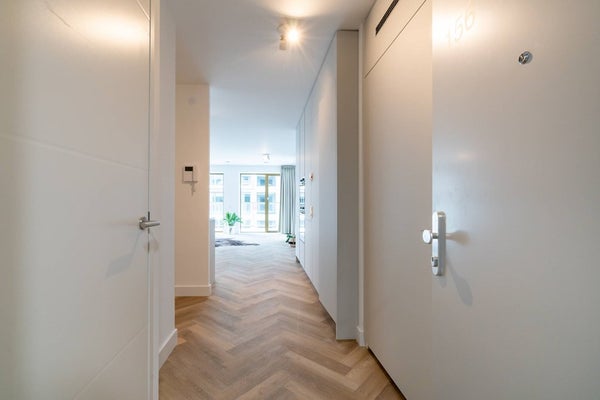 The entire apartment has a modern PVC herringbone floor. You enter the spacious hall, which provides access to the spacious bedroom, the living room, the separate toilet, the luxurious bathroom, spacious laundry/storage space and the meter cupboard.