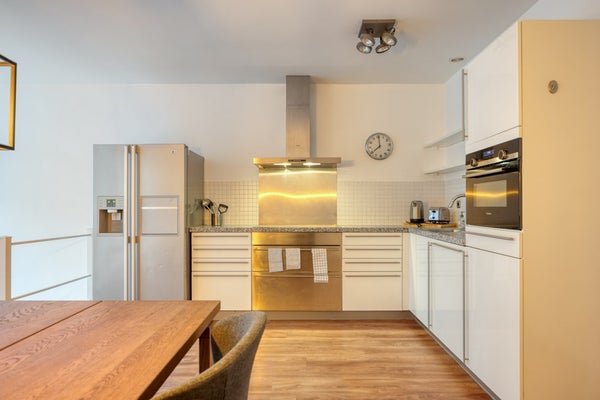 The lovely light-filled dining room is equipped with large windows that allow plenty of natural light to flood the space. The room feels open and inviting, offering space enough for both a comfortable dining area and a fully equipped kitchen. This kitchen holds everything you need, from a big American fridge, built in dishwasher, cooking plate and oven combination to all of your utensils.