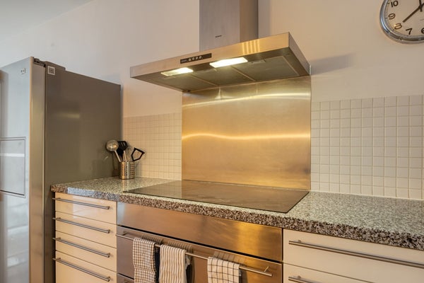 The lovely light-filled dining room is equipped with large windows that allow plenty of natural light to flood the space. The room feels open and inviting, offering space enough for both a comfortable dining area and a fully equipped kitchen. This kitchen holds everything you need, from a big American fridge, built in dishwasher, cooking plate and oven combination to all of your utensils.
