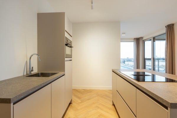 At the heart of the apartment is the bright living and dining area with an open kitchen. The kitchen is completely new and fully equipped, including a large fridge with separate freezer, induction hob with integrated extractor, dishwasher, sink, and an oven-microwave combination. There is plenty of cabinet space, perfect for anyone who enjoys cooking and wants everything within easy reach.