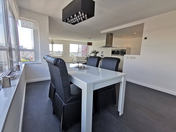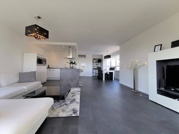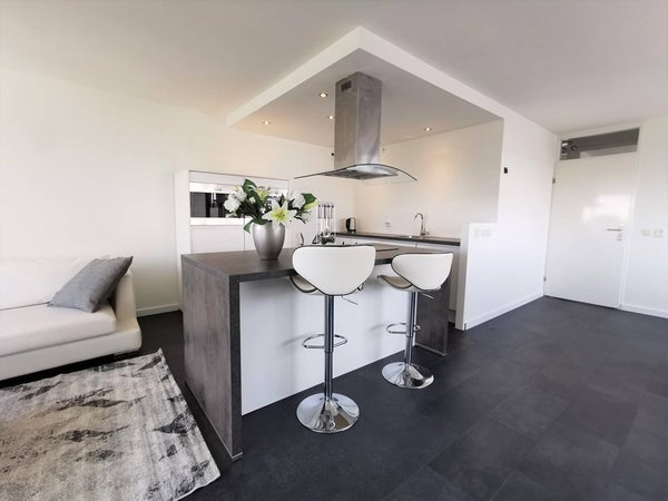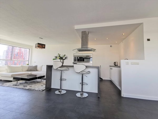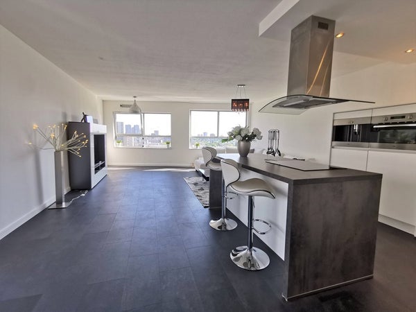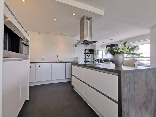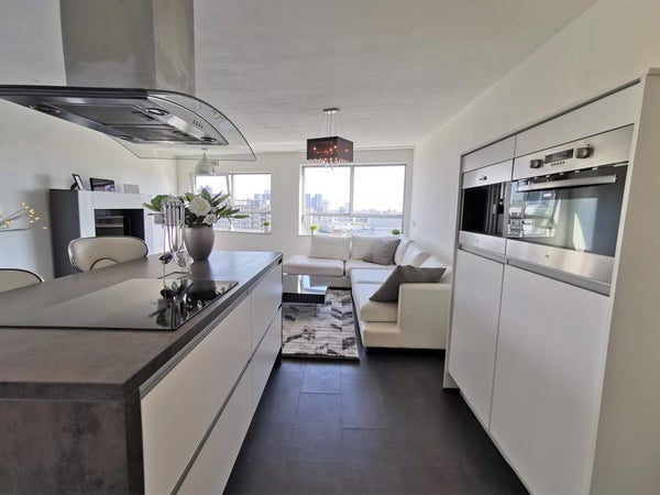 The living room with very luxurious open kitchen has a spacious sitting and dining area and is completely furnished. From the living room there is a magnificent view over the center of Rotterdam and the popular shopping streets.