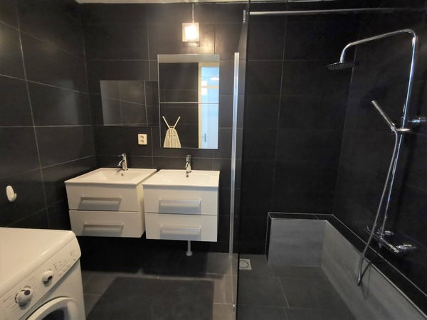 The modern and renovated bathroom is accessible from the hall and is equipped with a double sink with furniture, a spacious walk-in shower and the washer-dryer.