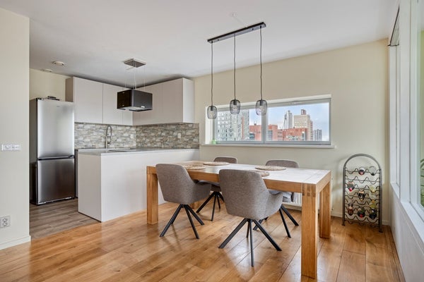 9th floor: Entry into a bright hallway leading to all rooms. The open living and dining area offers a comfortable setting with modern furnishings and large windows that bring in plenty of natural daylight. The sleek kitchen comes fully equipped with built-in appliances including a combi-oven, induction hob, fridge, freezer and dishwasher, perfect for those who enjoy cooking at home.