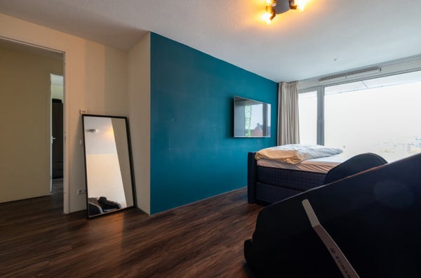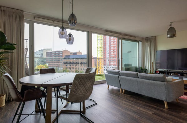 Layout: On the ground floor there is a shared entrance with access to the elevator and the stairwell. 4th floor The apartment entrance is located on the fourth floor. You enter into a very spacious hall with access to all rooms. The living room features large windows, creating a bright space with a beautiful view of the city center. The living room is furnished with a corner sofa, two armchairs, a sideboard, a TV with a cabinet, and storage space. The luxurious open-plan kitchen is accessible through the living room and is equipped with various Siemens appliances, including a refrigerator, freezer, induction cooktop, combination microwave, dishwasher, and a Quooker tap. From the living room you also reach the spacious balcony of approx. 14m2. 5th floor You can reach the 5th floor via the stairs in the living room. Bedroom 1 has a double bed and a linen closet. Bedroom 2 is spacious and has a sofa bed. The third bedroom is currently used as a children's room. The luxurious bathroom features a bathtub, shower, vanity with mirror, and designer radiator. There's also a separate toilet and a utility room with a washing machine and dryer. The entire apartment has underfloor heating. New beds will be placed in bedroom 1 and 2. Bedroom 3 will be decorated as an office.*also suitable for a student or student couple