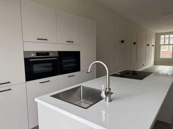 Because the living room is slightly elevated, you can enjoy views of the Essenburgpark from your sofa while maintaining complete privacy from passersby. The kitchen-diner offers ample space for a large dining table and features floor-to-ceiling windows that flood the room with natural light. The modern open kitchen is fully equipped, including a kitchen island with a new induction hob and high-end built-in appliances such as a Siemens combi-microwave and a recently installed (2025) refrigerator with a freezer compartment.
