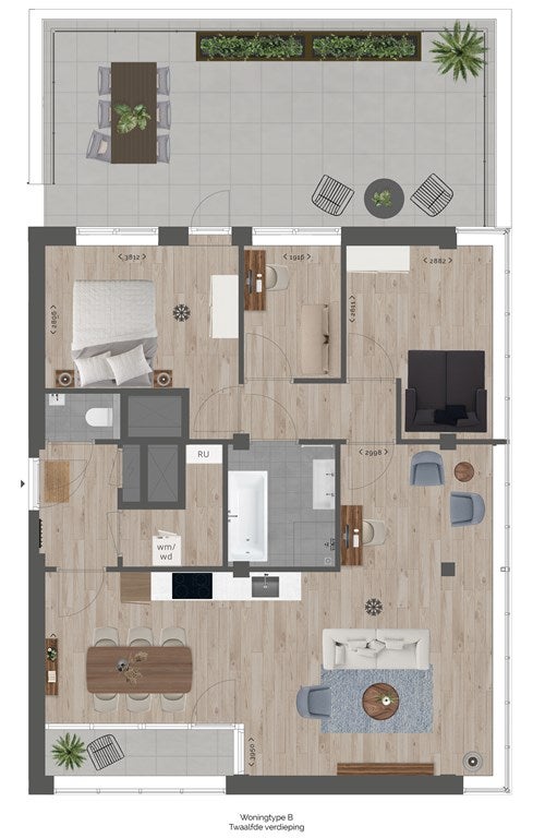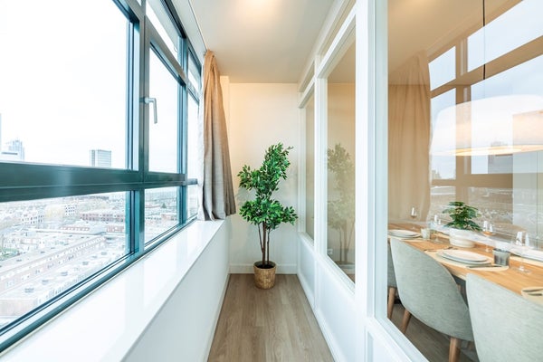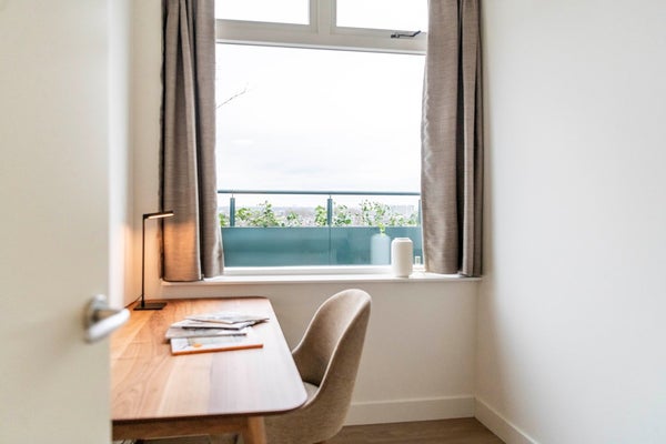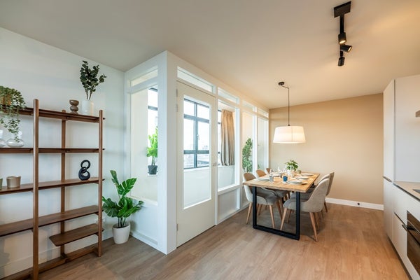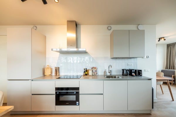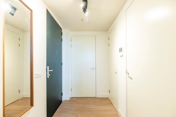 12th floor (Penthouse): The spacious and bright living room features a lovely open kitchen equipped with modern appliances, including a combi oven, induction hob with extractor, dishwasher, fridge/freezer and a sink. The L-shaped layout of the room allows for a comfortable sitting area and a pleasant dining space. An additional second workspace has also been created here, making the living area highly functional. From the living room you have direct access to the large L-shaped balcony, where you can enjoy a spectacular view over the Rotterdam city centre.