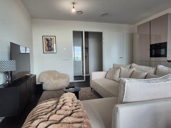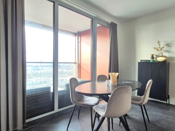 This brand new apartment is tastefully furnished and ready to move in. The bright living room offers a comfortable seating area and dining space. The modern kitchen is fully equipped with all necessary appliances and quooker. From the livingroom and bedroom you can enter balcony directly, decorated with easy lounge, and with amazing view.