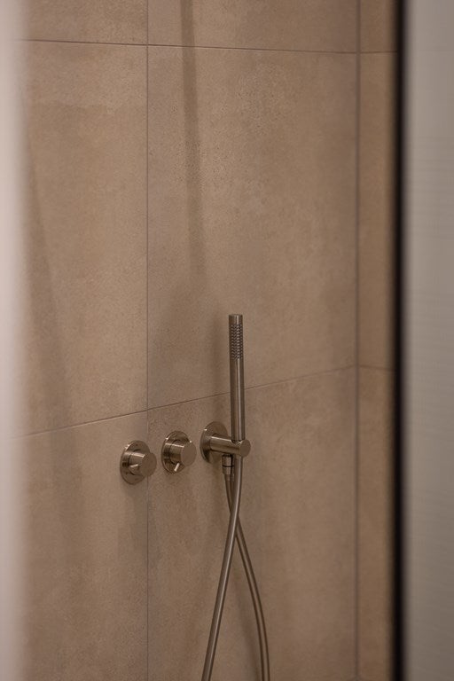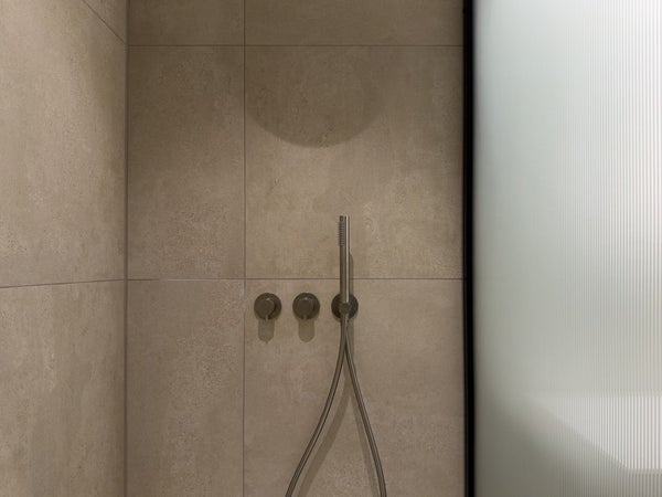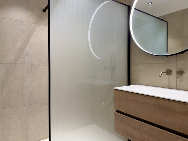 Bathroom (Ground Floor): The newly renovated bathroom on the ground floor is luxurious and modern, featuring a spacious walk-in shower, a stylish washbasin with a vanity unit, and a designer radiator. The large tiles throughout the bathroom contribute to a sleek, contemporary look.