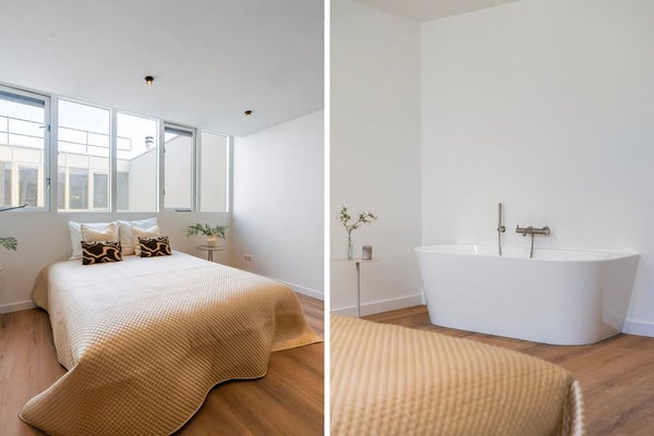 The master bedroom is a real eye-catcher. Peace, space, and luxury come together here, with the absolute highlight being the freestanding bathtub in the middle of the room. A unique, boutique hotel-like experience – right at home.