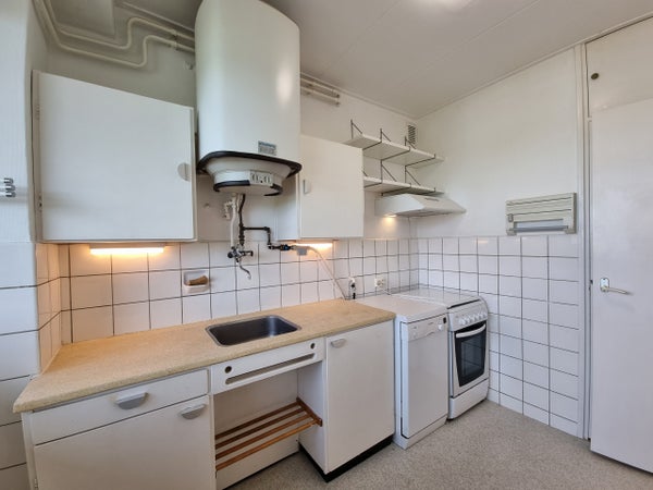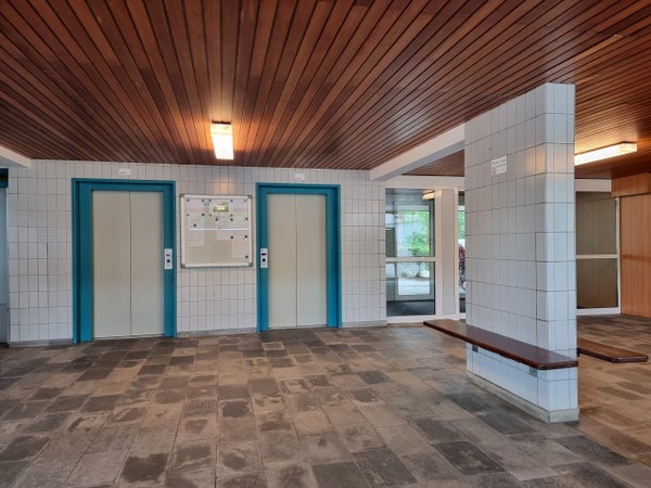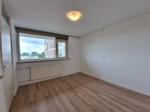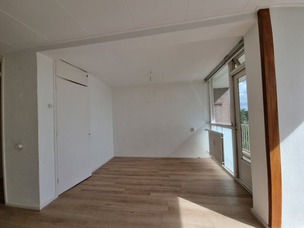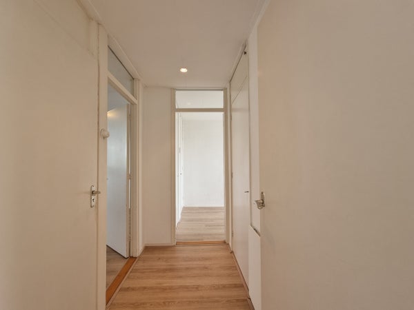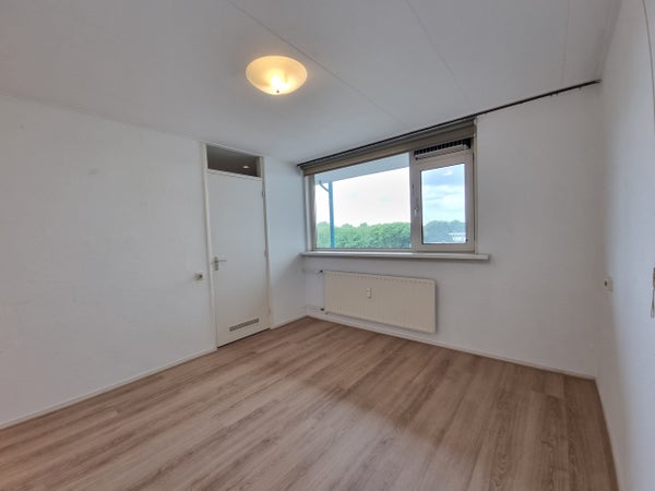 Layout Shared entrance to the apartment building on the ground floor with automatic sliding doors, video intercom, and elevator access. The building is surrounded by a large garden and two private parking lots. 5th floor Entrance with hall to all rooms. Hallway with access to all rooms. The living room opens onto a spacious and sunny southeast-facing balcony. The classic Bruynzeel kitchen in light colors is equipped with various appliances, including an electric oven, 4-burner gas cooktop, and dishwasher. Two spacious bedrooms are located at the front and rear of the house. The bathroom, accessible through bedroom I, is equipped with a bathtub and sink. Connections for the washing machine and dryer are also located here. Details: - 6 built-in wardrobes - Fiber optic internet - A caretaker is present every day - The rental price will be increased by €63 advance payment for heating costs - The tenant must conclude contracts for TV, Internet and other utilities himself
