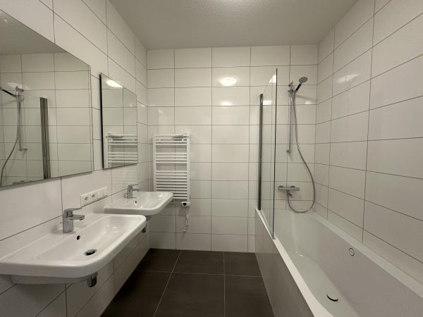 The fully tiled bathroom features a bathtub with shower, double sinks, and a heated towel rail.