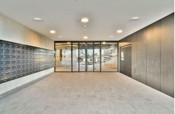 Central entrance with two elevators and a luxuriously finished shared hallway with parcel lockers, a doorbell panel with a camera, and mailboxes.