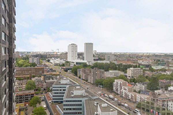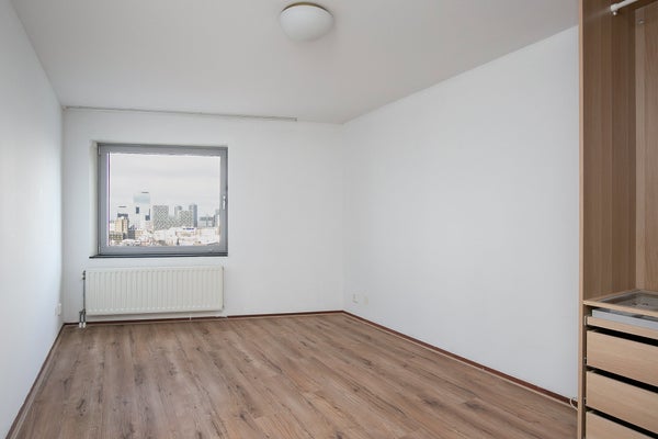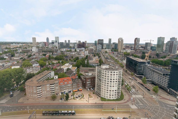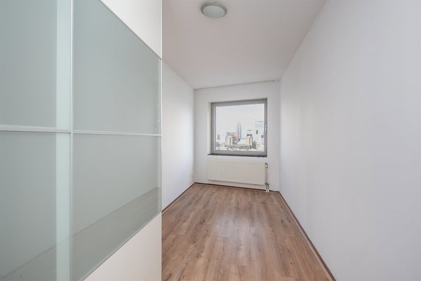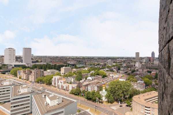 On the 33rd floor of the iconic De Hoge Heren complex, this spacious and bright apartment offers stunning views of the Rotterdam skyline and the Maas. Featuring two bedrooms and a practical semi-open kitchen, it is designed for comfortable living. The light-filled living room opens to a loggia, an ideal spot for enjoying morning coffee or unwinding in the evening. Located next to the Erasmus Bridge, it's only a twenty-minute walk to the vibrant city center, with shops, restaurants, and cultural amenities. Nearby restaurants, museums, and theaters enhance the appeal, while excellent public transport connectivity makes commuting easy. You can rent a parking space in the garage for €143 per month. Rent is €1905 per month with service costs of €101. This apartment is available now!