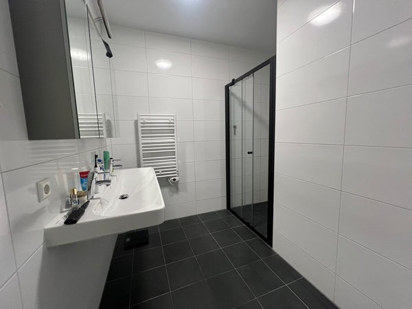 The bathroom is equipped with a shower, towel radiator and washbasin with mirror.