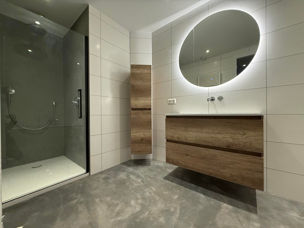 The luxury bathroom features a spacious walk-in shower with rain showerhead and hand shower, a bathtub, and a modern washbasin with cabinet and mirror with atmospheric backlighting. The toilet is separate.