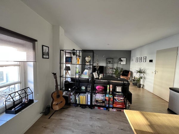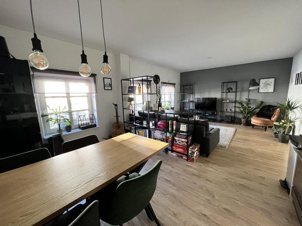 At the front is the spacious and cozy living room (6.83 x 4.20), equipped with an open kitchen with extractor hood. The current tenant will take the remaining appliances.