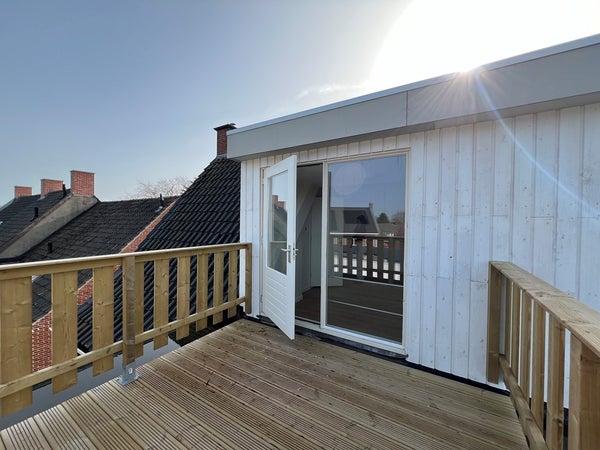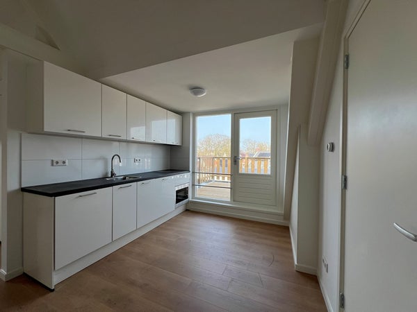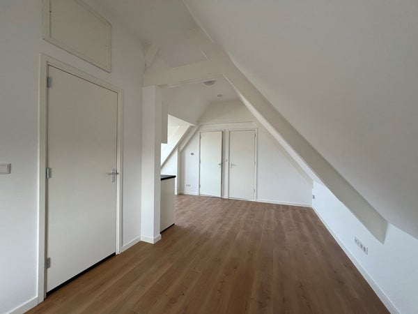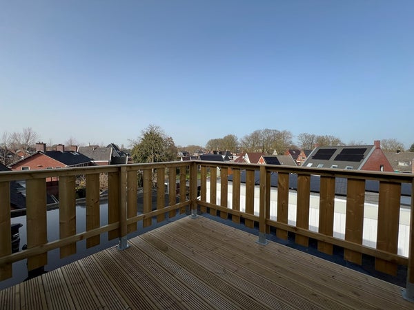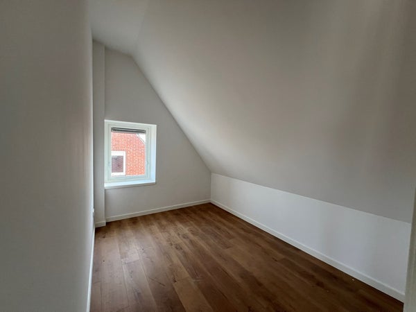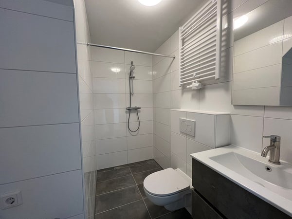 You enter a shared hall, which you share with two other addresses. The apartment is located on the first and second floors and has a living area of approximately 45 m². It has three small bedrooms, spread over both floors. Upon entering, you step into the living room with open kitchen. The kitchen is equipped with an extractor hood, induction hob, combi oven, refrigerator, and dishwasher. The bathroom has a shower, sink, and toilet. The apartment also has its own roof terrace. Finally, the apartment includes a shared parking space, which is shared with the two other addresses.