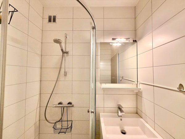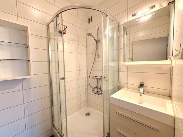 On the left side of the apartment is the spacious bedroom. The adjoining bathroom is accessible from the bedroom and is equipped with a washbasin unit and shower cabin. The bedroom also provides access to the second balcony.
