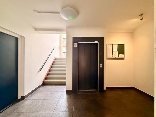 Entrance to the shared hall with mailboxes, access to storage rooms, stairwell, and elevator.
