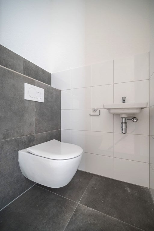 The bathroom features ceramic tiles in the color anthracite, a sink with matching shelf, walk-in shower, washing machine connection and a mirror. The apartment has its own storage room and a separate toilet. The apartment has 2 bright bedrooms. There is also an extra indoor storage room with natural light.