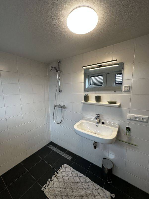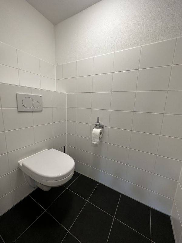 Bathroom and toilet is provided with anthracite and white tiling.