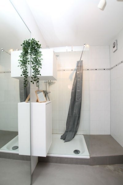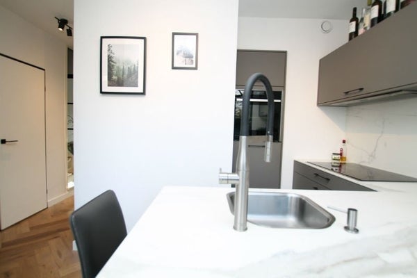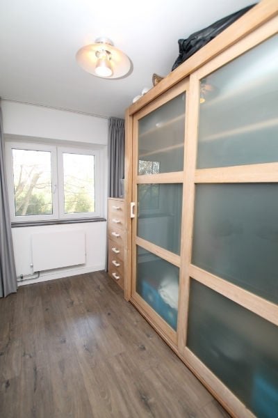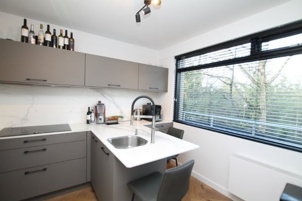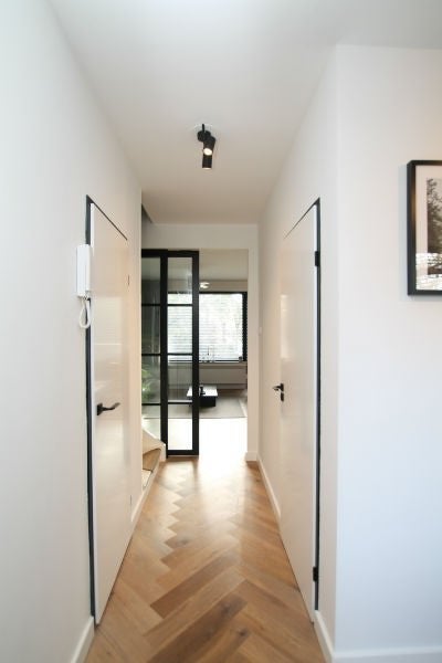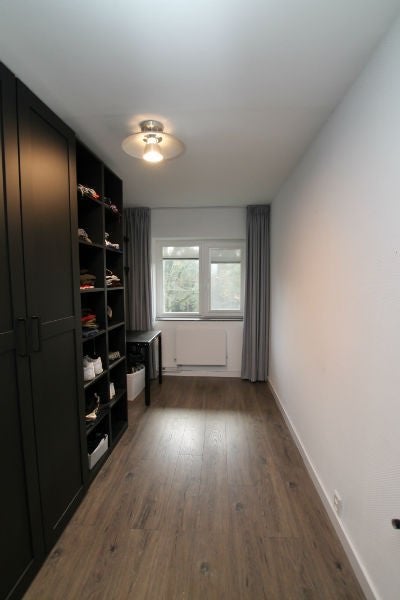 Upon entering, you will find the hallway which provides access to the kitchen, the toilet, and the living room. The playful kitchen is thoughtfully designed, with bar stools creating a charming open kitchen. The kitchen is equipped with various built-in appliances such as a fridge-freezer combination, dishwasher, induction cooktop, and a stainless steel extractor hood. The living room is very modernly furnished with a beautiful seating area and a comfortable dining table. From the living room, you can access the balcony and the stairs to the first floor. The balcony is accessed from the living room and offers views of all the surrounding greenery. Two bedrooms are located at the front of the house and have an area of 10m2. The rooms are equipped with large wardrobes that span the length of the long wall. The master bedroom is located at the rear of the house and has an area of 14m2. This bedroom is located at the rear of the house and has an area of 10m2. Here are the washing machine and dryer. The bathroom is equipped with a walk-in shower with glass partition and shower curtain, a toilet, and a sink with a mirror above it with built-in lighting.