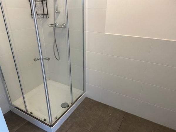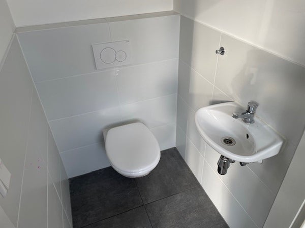 Modern bathroom, which is provided with a shower, sink, mirror and mechanical extraction. Seperate toilet. Closet with washingmachine connection.