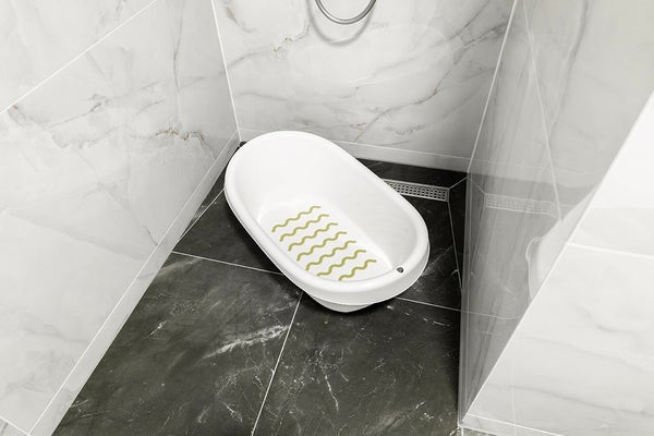 The bathroom and toilet are separate. The spacious bathroom has a rain shower and plenty of storage space.