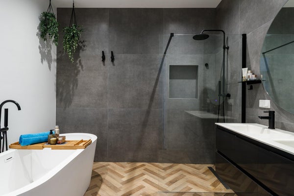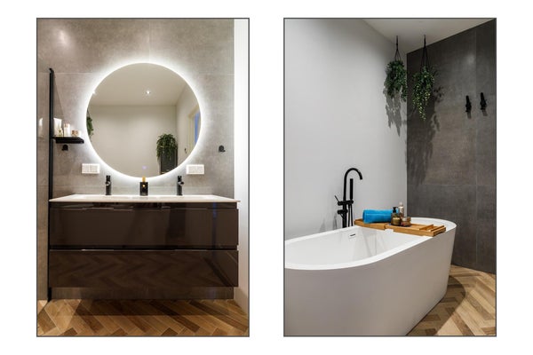 The luxurious bathroom has a freestanding bathtub, spacious walk-in shower, and stylish bathroom furniture with double sink.